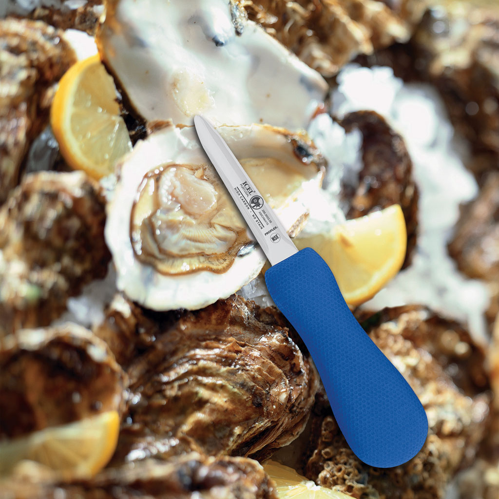 An American oyster knife design, the Boston style knife with a shorter blade is best used when working with small and medium sized oysters.