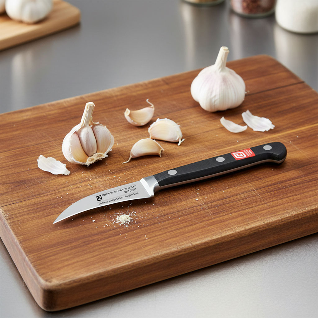 Used by the professional chef to Tourné (turn in English) vegetables, this knife is also great for removing seeds and performing other small intricate cutting jobs; the sharp point is also useful for removing the eyes of potatoes and other blemishes! The professional chef will hold a paring knife in one hand and the item being cut in the other hand. This knife is also known as a "bird's beak".