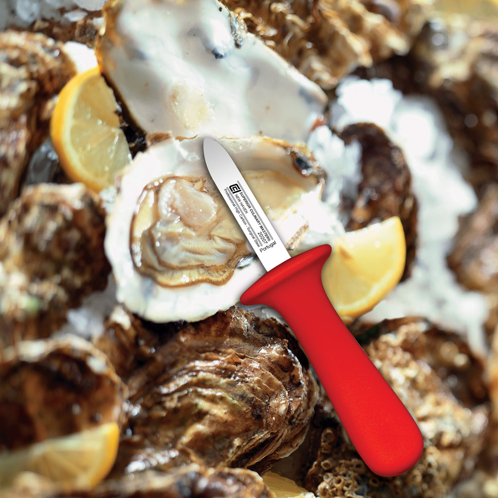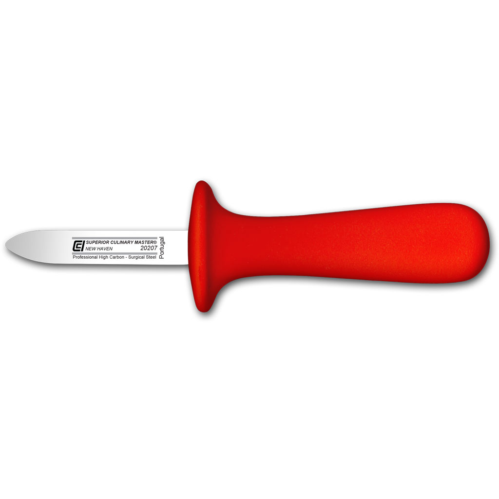 The New Haven style knife is designed to allow the blade to easily slip into the shell of an oyster. It provides superior strength to pry it open and is particularly useful when perfect oysters on the half shell are desired.