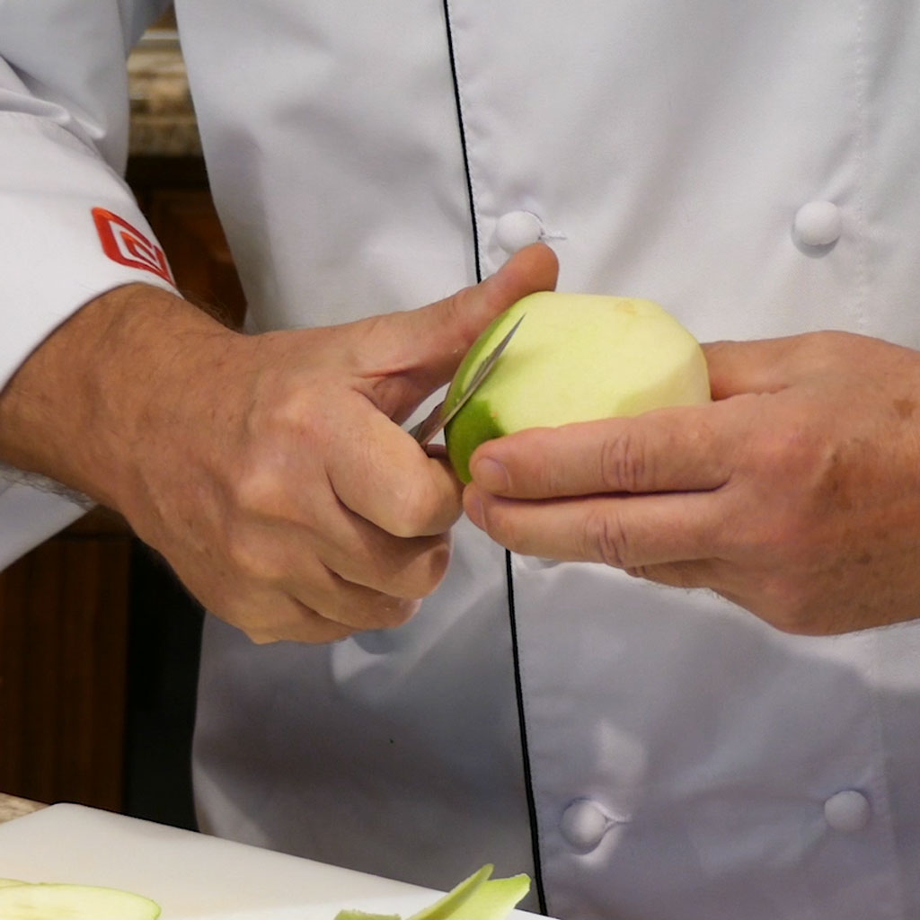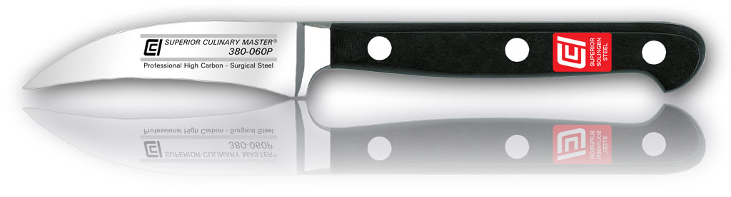 Used by the professional chef to Tourné (turn in English) vegetables, this knife is also great for removing seeds and performing other small intricate cutting jobs; the sharp point is also useful for removing the eyes of potatoes and other blemishes! The professional chef will hold a paring knife in one hand and the item being cut in the other hand. This knife is also known as a "bird's beak".