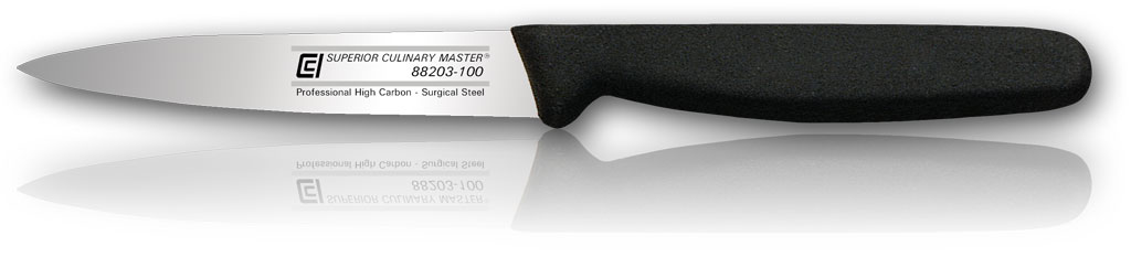 Can be used for peeling, removing seeds, de-veining shrimp, fluting mushrooms and trimming vegetables and fruits. Also used for small intricate garnishes and creative tasks. The professional chef will hold a paring knife in one hand and the item being cut in the other.